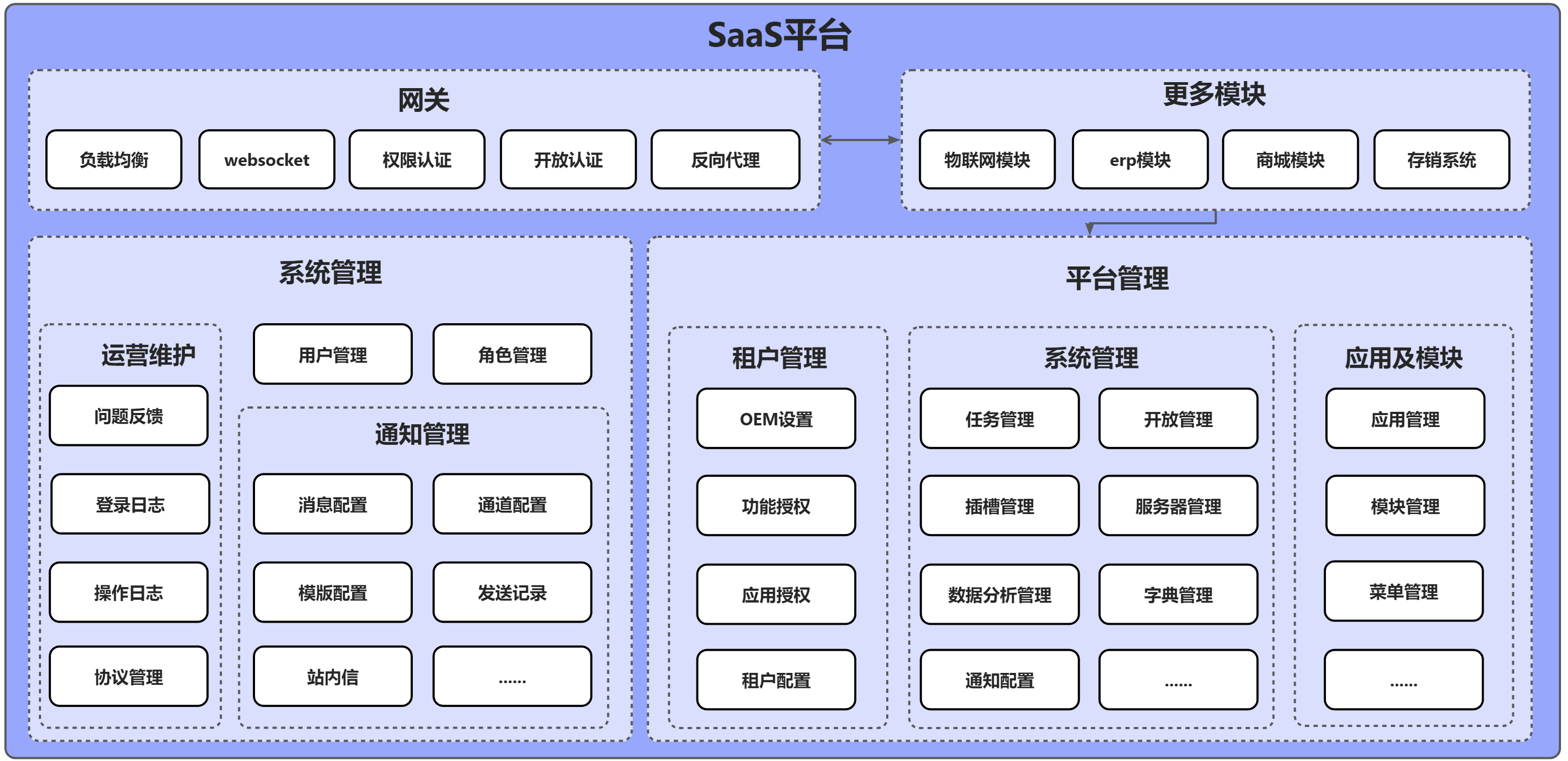 一套代码支持单体,微服务及集群模式部署,最低可以在2g内存的机器上运行,最高可以支持百万设备