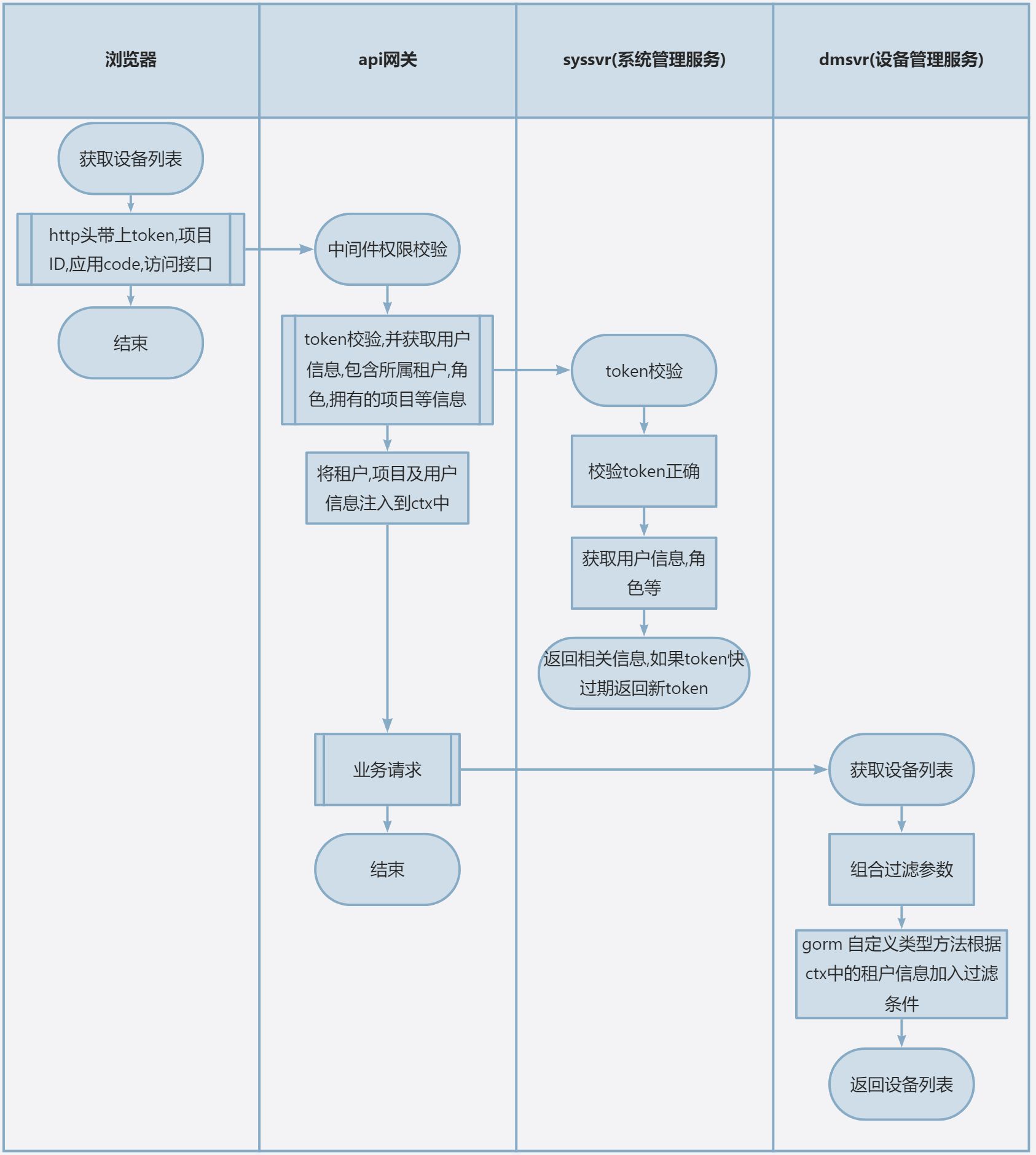 - 在一个请求过来之后,api网关有统一的中间件,将token信息传递给系统管理服务,系统管理服务会校验权限并返回用户的租户号等信息,然后中间件将这些信息放到ctx中.