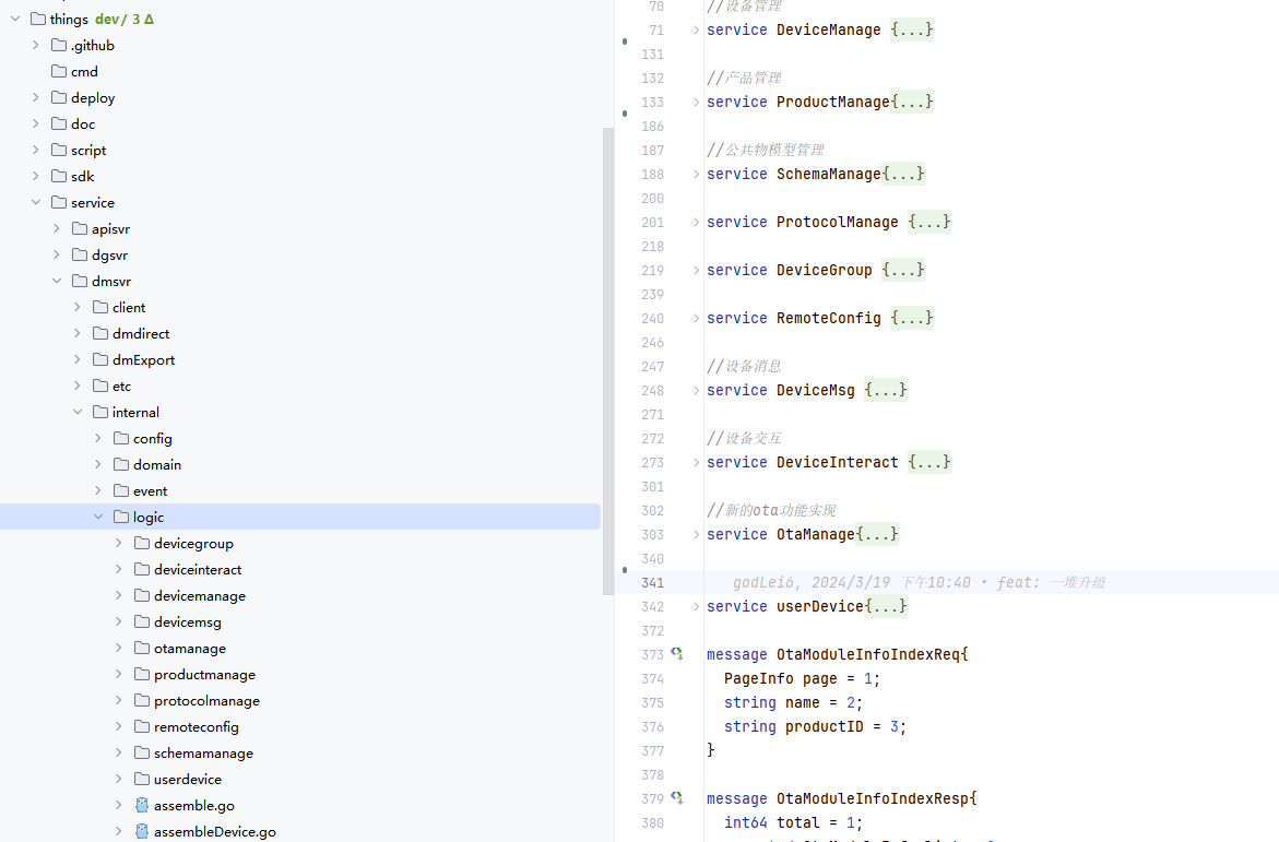 - 代码生成: 首先我们需要借助gozero的代码生成工具(goctl)来实现同时支持的能力,goctl在生成rpc的代码的时候会生成封装好的客户端请求代码,服务端的处理代码.联犀通过修改生成的模版,同时生成rpc请求代码和直连的代码,由于对外都是相同的interface,所以只有初始化的时候有差异,在业务内使用是完全一致的.生成的代码示例:
