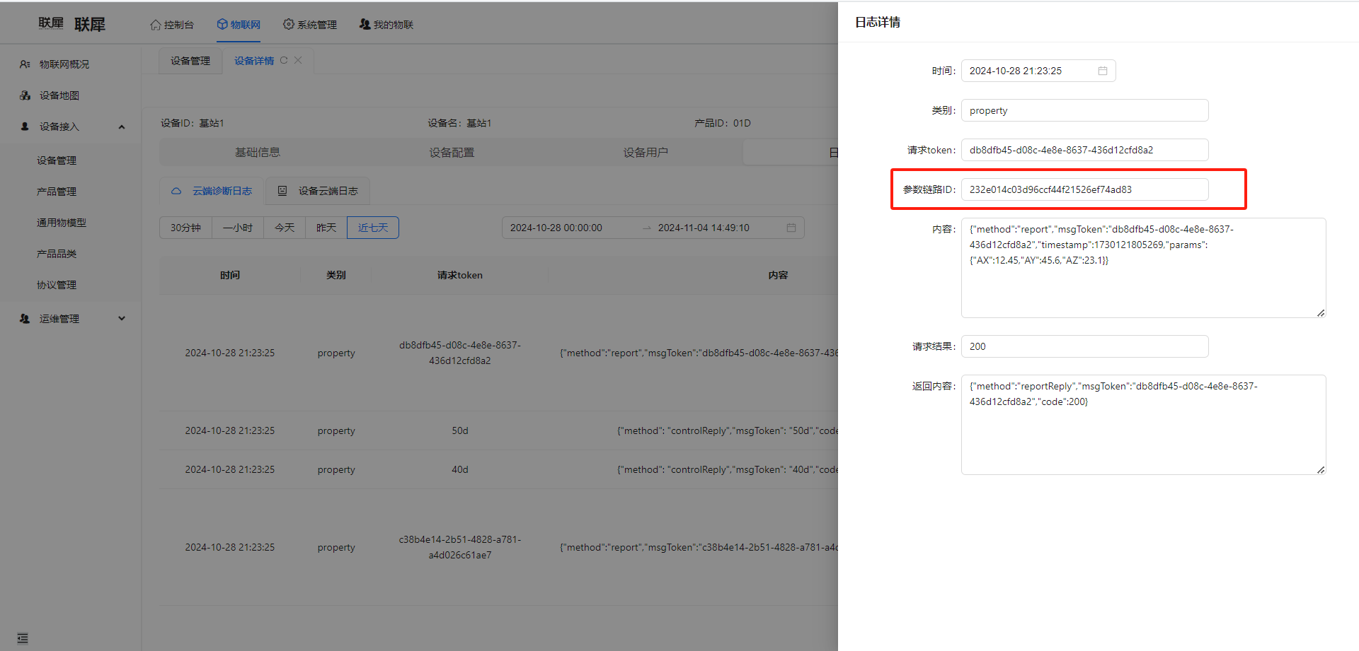 同时在mqtt接收到设备消息的时候会第一时间把链路ID生成并注入到ctx中,保证通过查询msgToken能获取全链路ID,同时,在云端操作日志中也可以看到该链路ID,在联犀的日志上下文中会打印,并在日志中记录链路ID