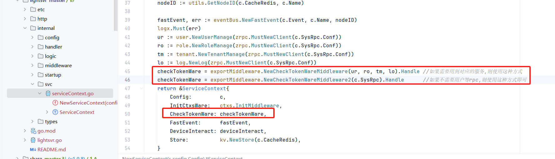lightsvr/internal/svc/serviceContext.go的 ServiceContext 添加 和api文件定义一致的中间件CheckTokenWare rest.Middleware - 中间件初始化 参考代码: