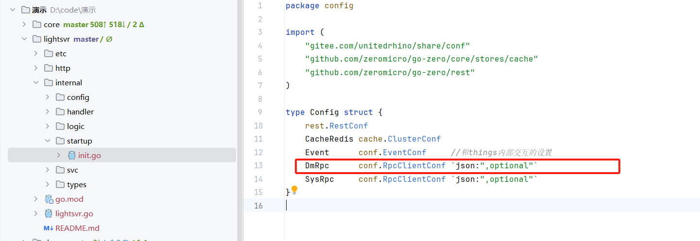 在gozero中所有的依赖都定义在 internal/svc/serviceContext.go 中,我们的服务初始化也定义在这里.