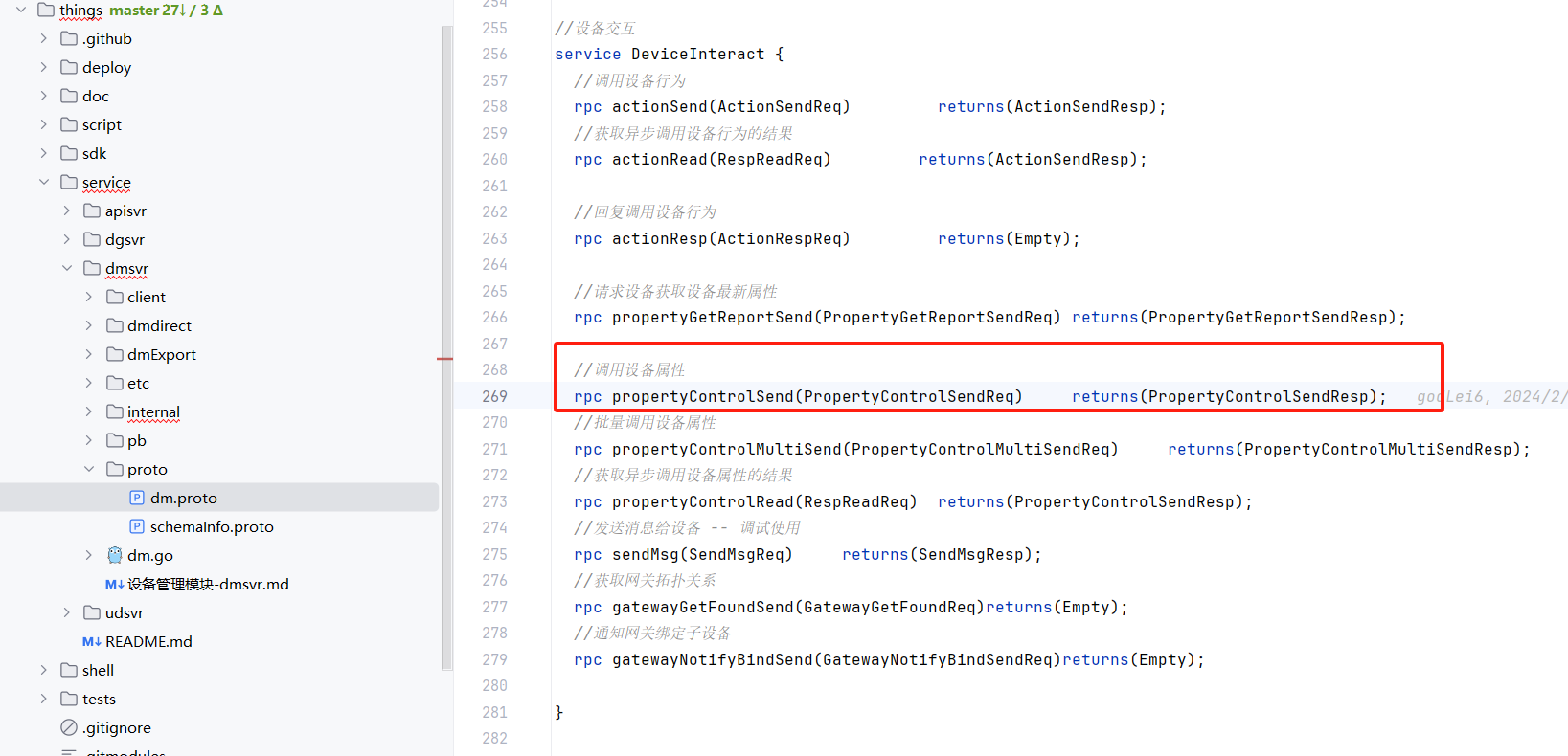 我们这里是需要进行设备控制,首先我们需要查看dmsvr的proto,来找到对应的接口 things/service/dmsvr/proto/dm.proto:269 可以在对应的位置上看到我们需要调用的接口定义: