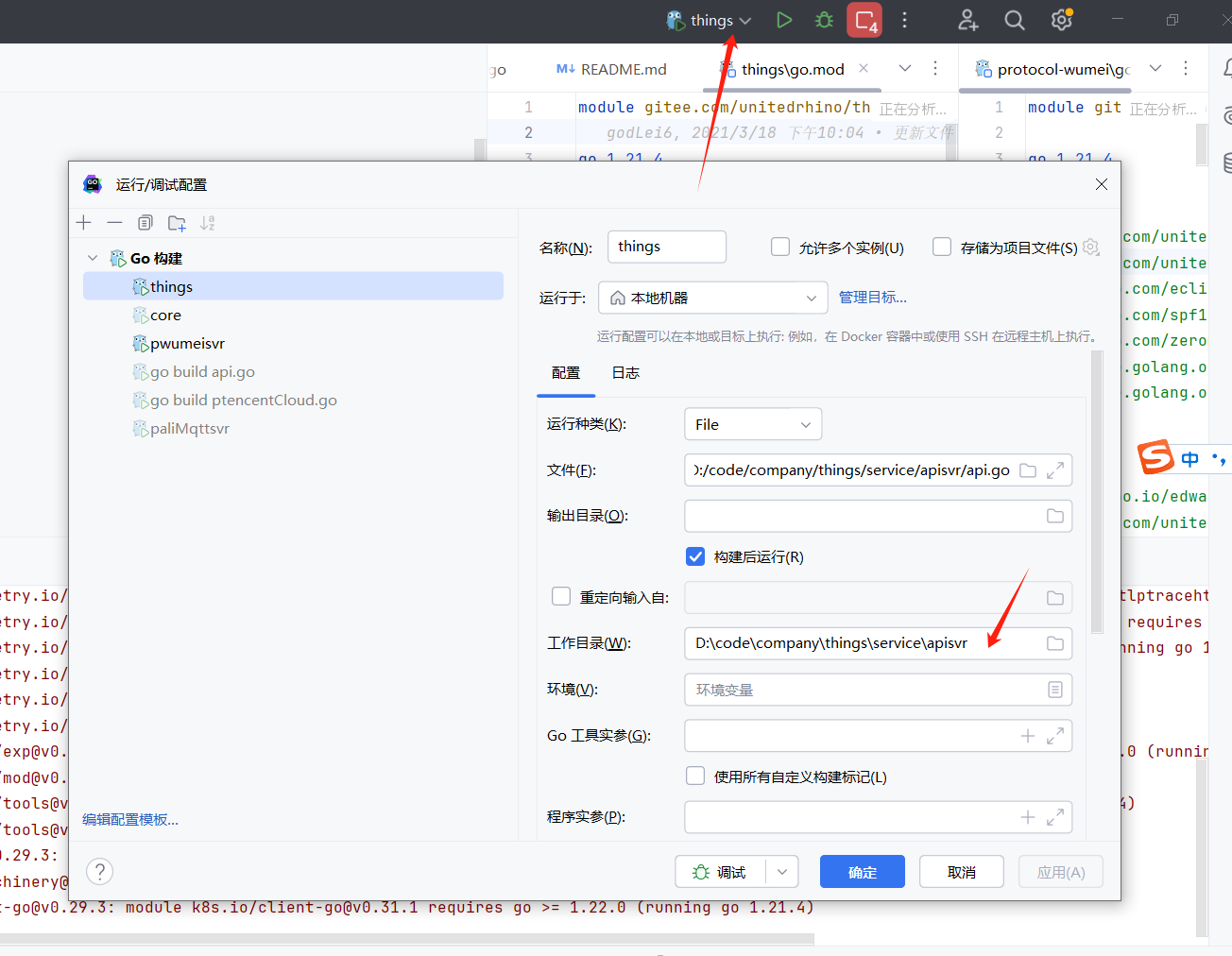 在goland中直接运行服务会报找不到配置文件,我们需要做一个配置,参考下图,点击上面的按钮,然后点击编辑配置,会出现下面的页面,将工作目录修改为服务的main函数所在的位置即可正常启动