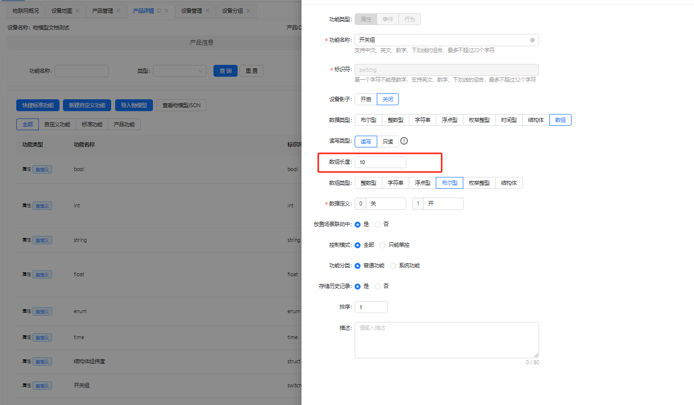 - 数组类型: 数组类型比较特殊,常规物联网平台的数组是没法操作某一位的,如如果我想单独修改开关10的状态是不允许的,必须传[0,1,1,0,1,0,1,1,0,1]这样完整的数组才能控制,但是这其实是不符合真实的世界的,联犀将数组进行拓展支持下角标访问,如我需要更改开关10为开,则传递