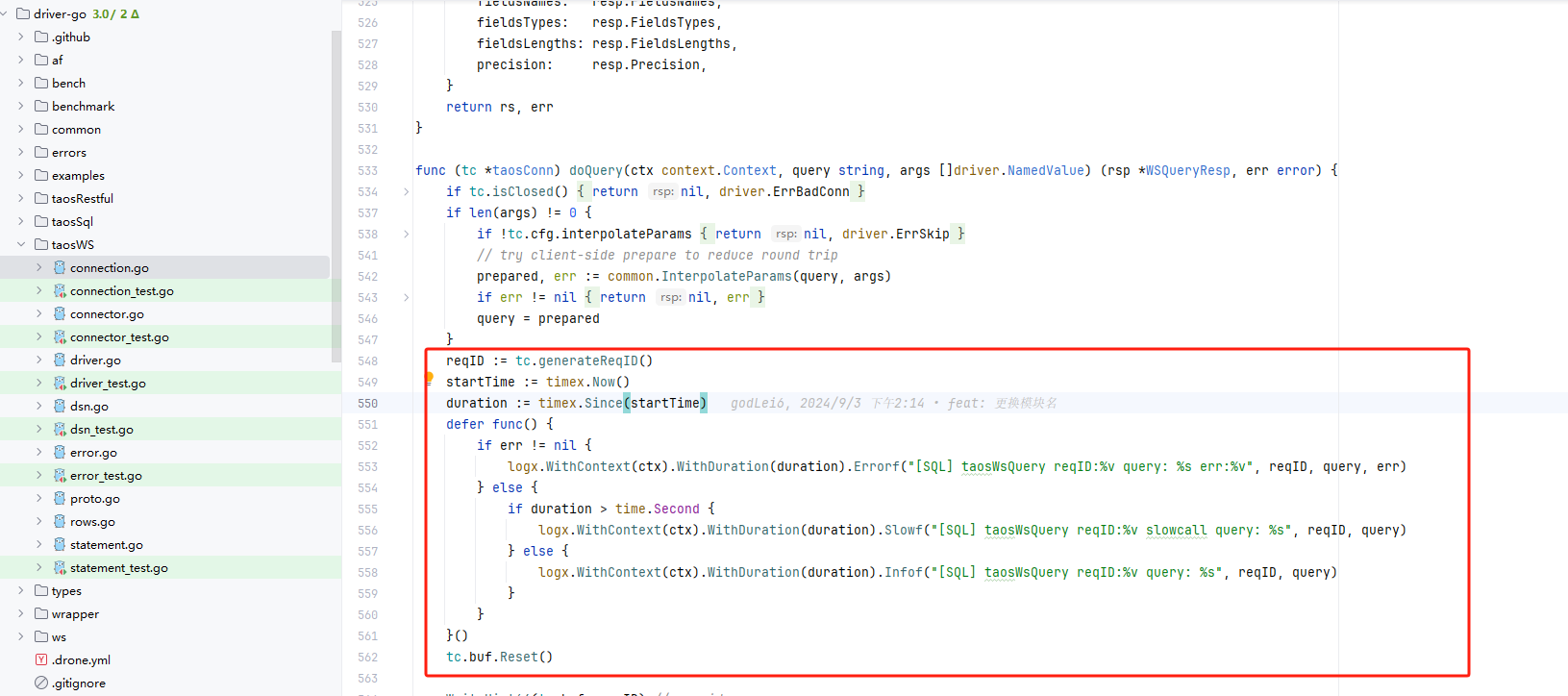 无论是那种连接方式(http,ws,cgo),日志都是打在driver-go/taosWS/connection.go connection.go文件中。