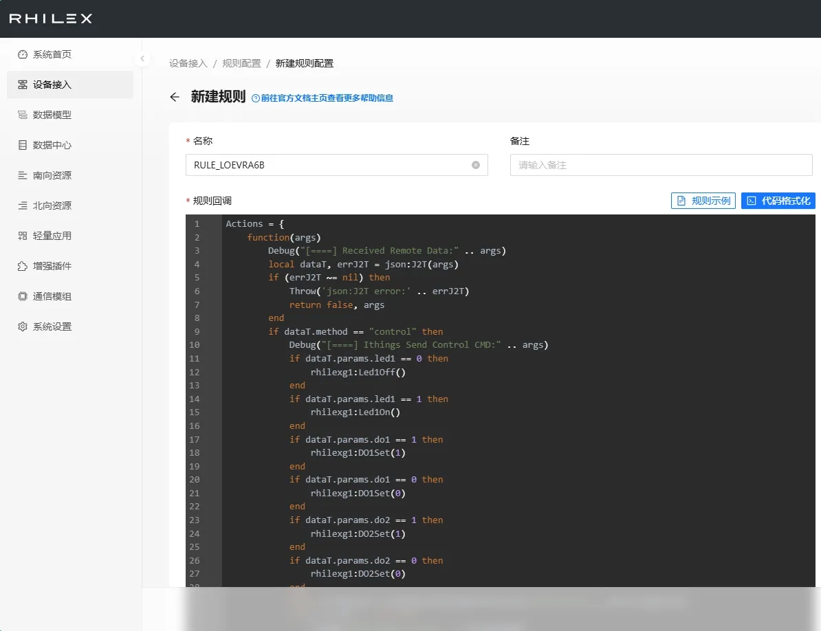 注意:该示例仅仅在rhilexg1网关内有效,具体的设备操作接口有所不同。