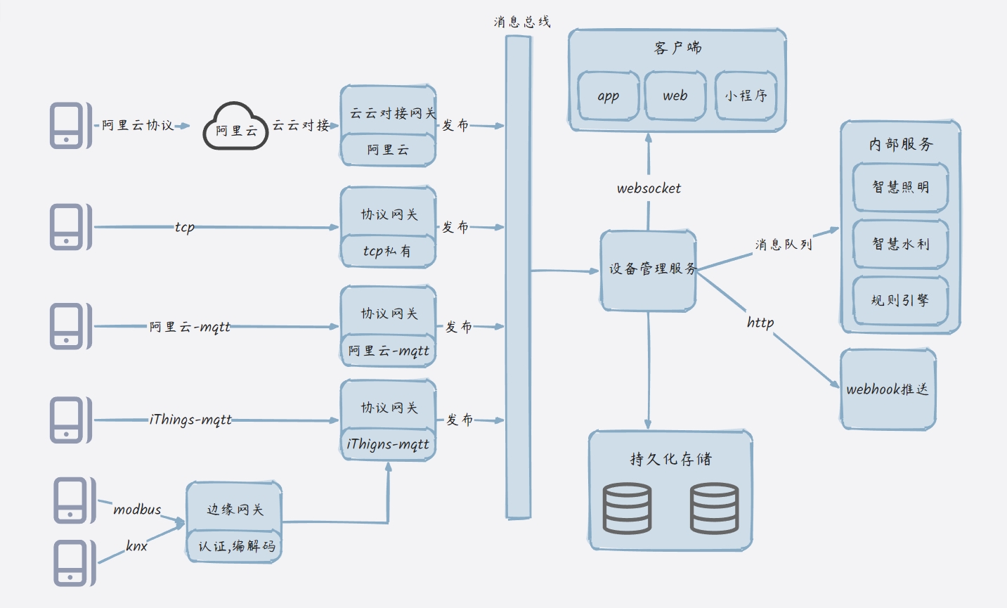 • 下行: 联犀服务(通过不同的topic进行分发)-nats>协议转换网关-xx协议>设备