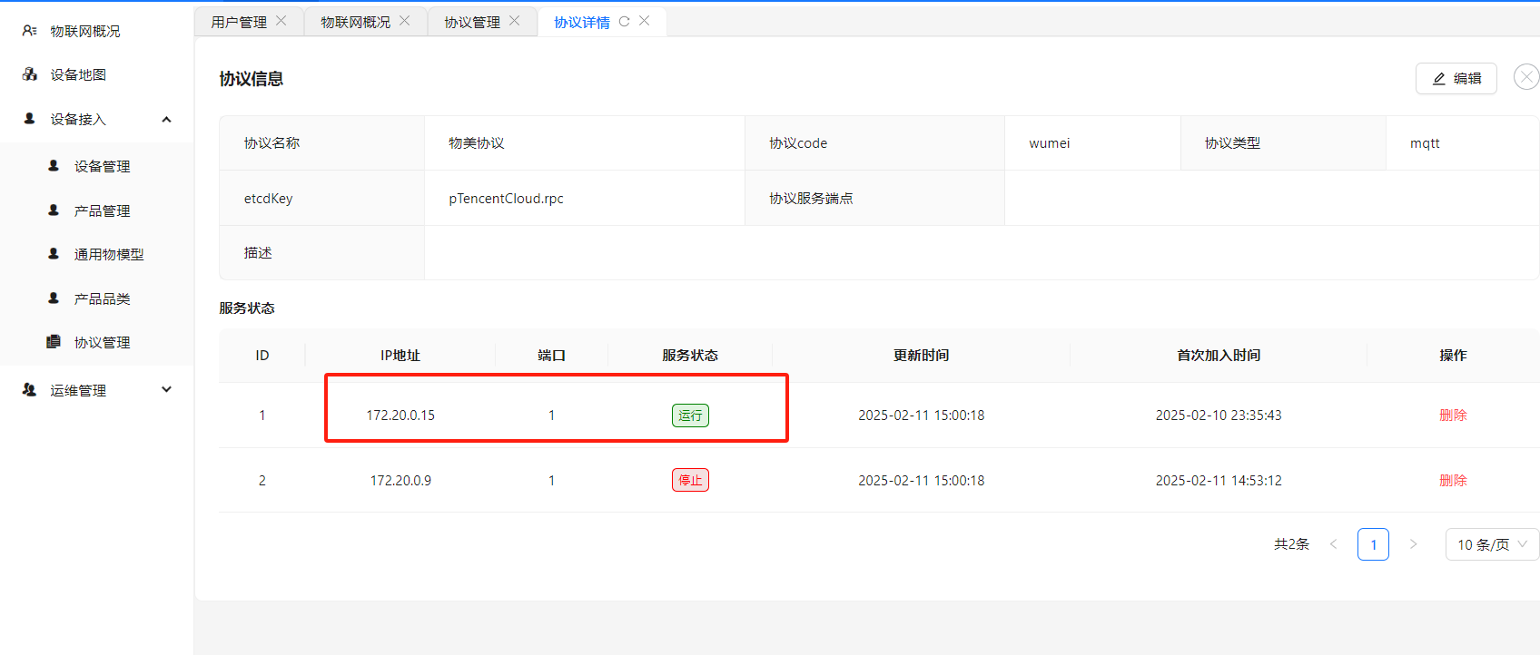 1. 点进去之后可以看到该协议组件的运行状态,运行状态就是正常的.(协议会定时向联犀上报心跳,如果超时未上报会变成停止状态)