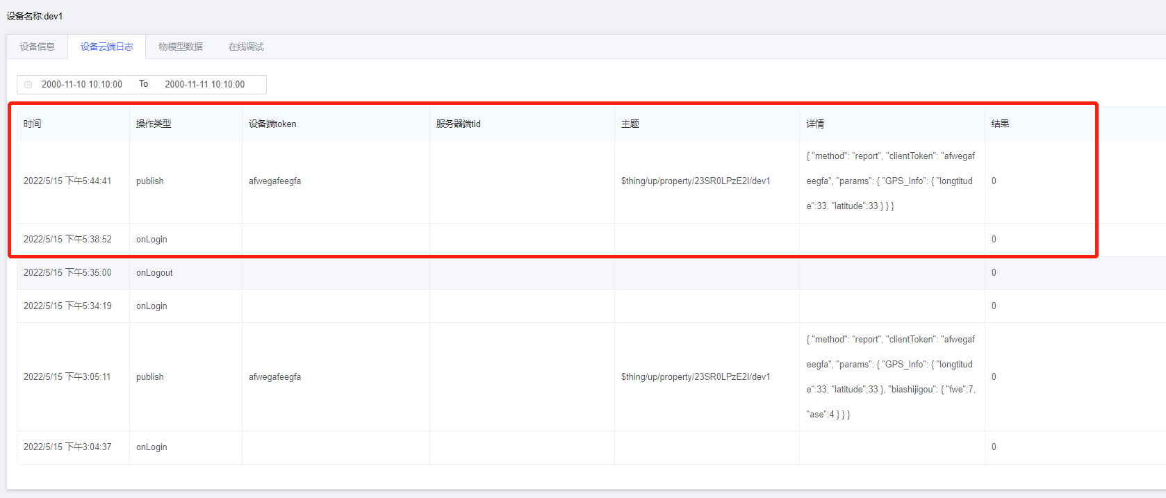 可以看到和发送的数据一致,我们在看看云端日志是否正确: