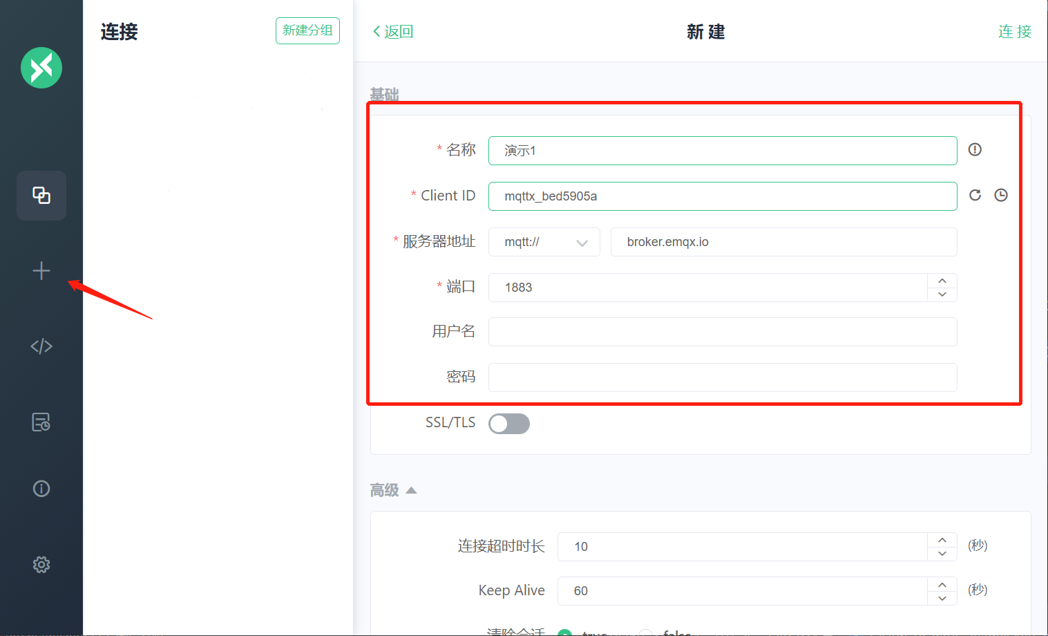 - 打开 MQTT X 客户端程序,单击左边的【+】,创建一个新的配置文件,输入自定义名称。