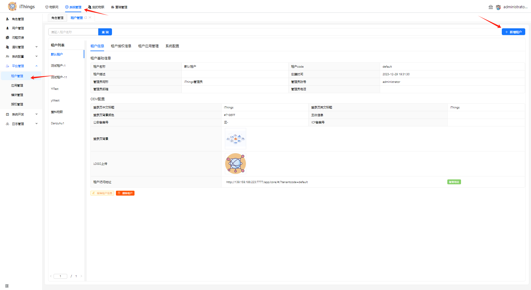- 上面的用户信息是这个租户管理员的账号信息,租户管理员拥有该租户的最高权限