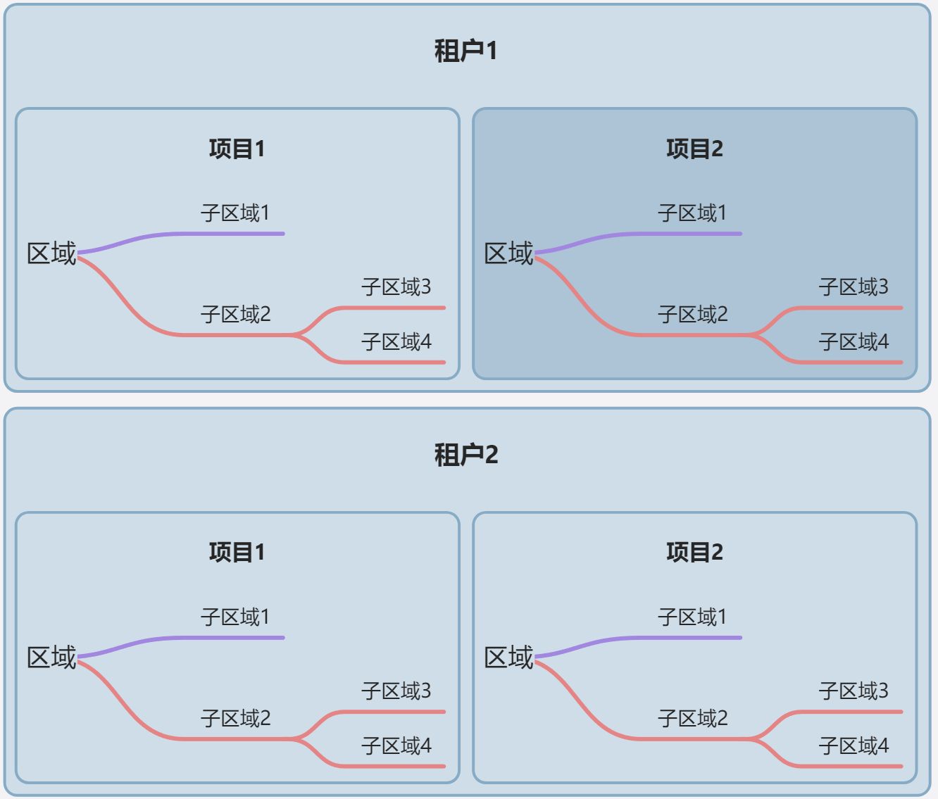- 区域: 区域归属于某个项目,区域是树状的,可以嵌套无限层,可以给用户授权某一个节点的权限,也可以授权某一个节点及其子节点的权限,使用非常灵活