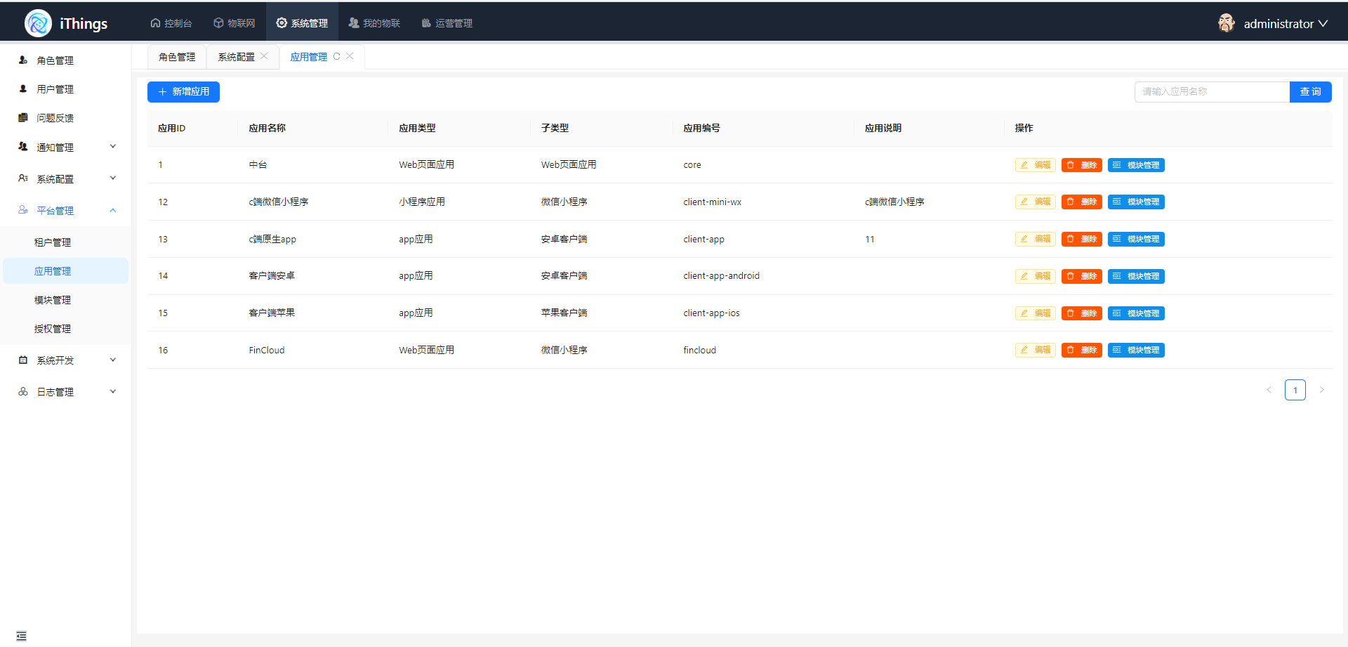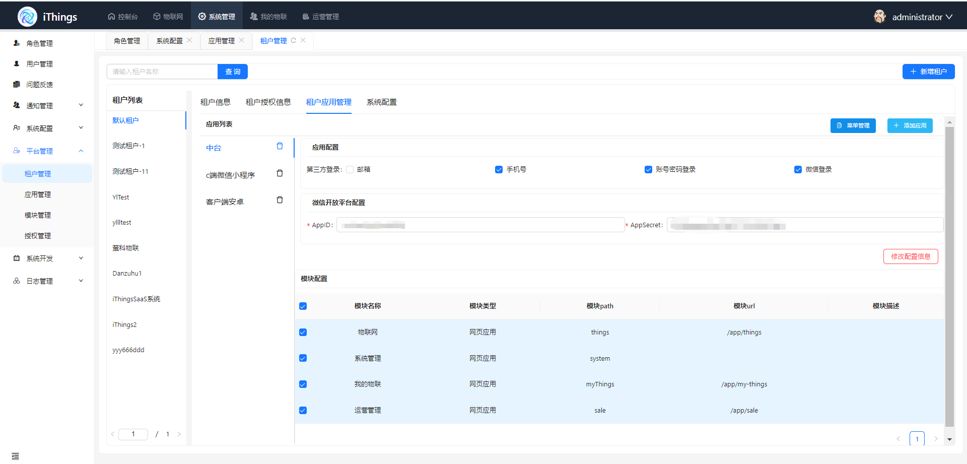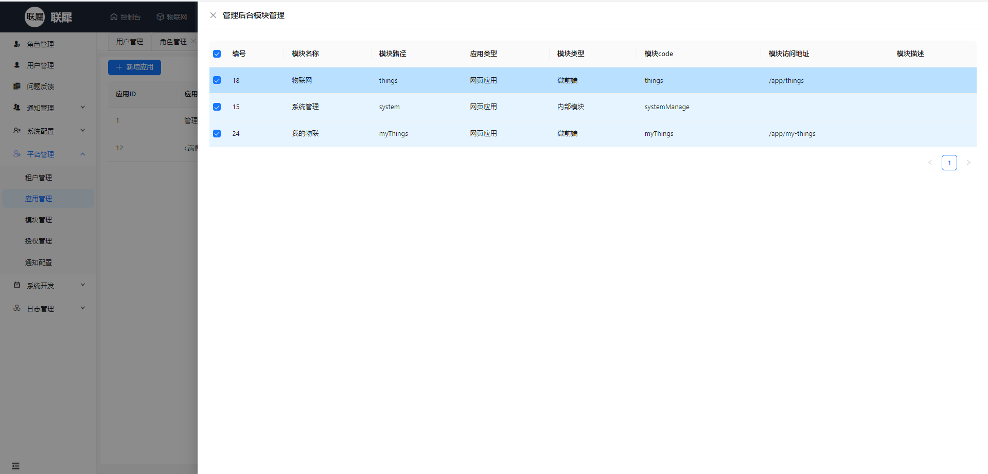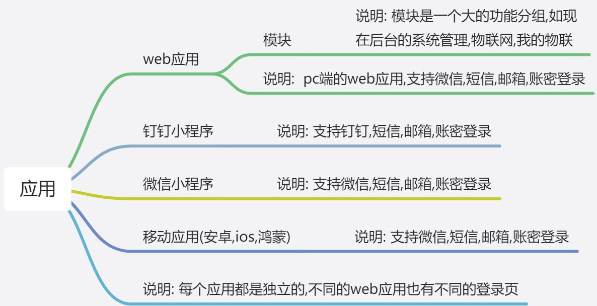 模块配置(web应用才需要): 模块是一个大的功能分组,如现在后台的系统管理,物联网,我的物联. 这里需要定义好模块信息和对应的菜单信息,然后在应用管理中绑定对应的模块,便于模块复用.