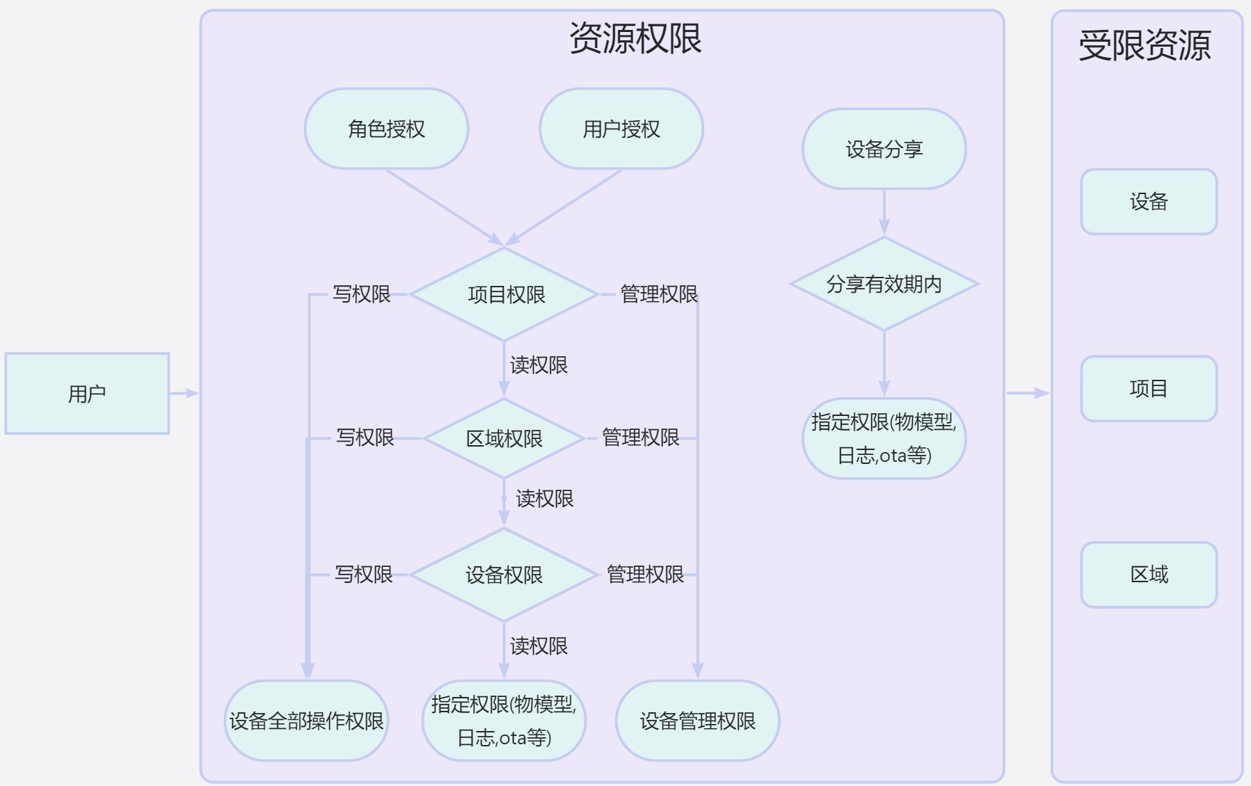 - 写权限: 拥有修改该资源的权限及自动获取该资源下所有资源的权限,如授予项目管理权限,则自动拥有项目下所有区域和设备的权限