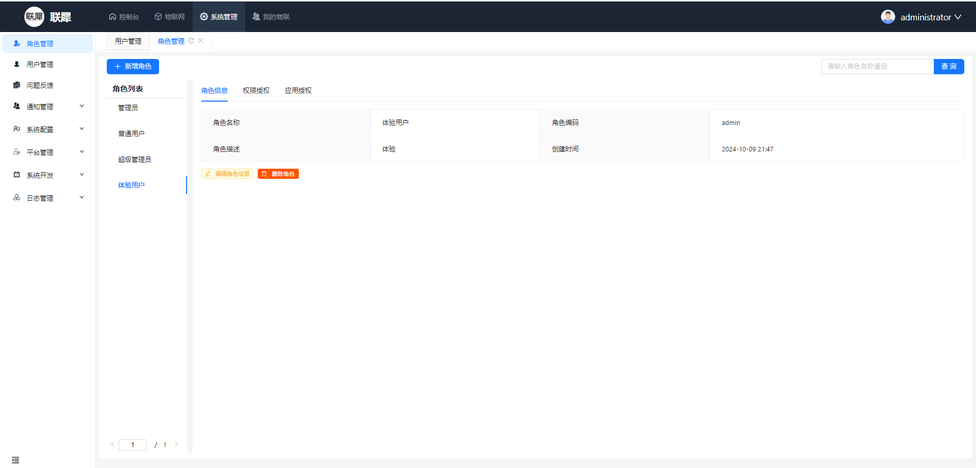 当我们需要定义自己的角色的时候,可以借助内置角色的编码来实现对应的能力,如我们需要一个全局的运维人员,这时候就可以给他的角色编码赋值为admin,这样他就有全局的设备权限,然后给他授予他能看到的功能和应用权限即可.