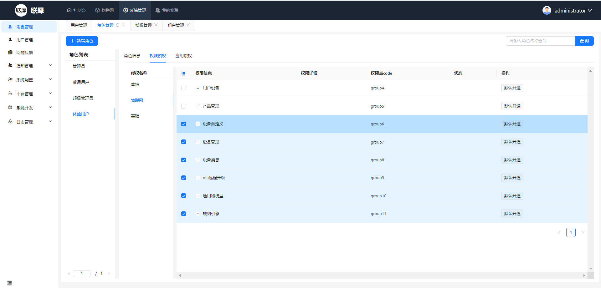 - 超级管理员(supper): 租户创建时指定的管理员默认为超级管理员,并且无法取消,该角色不受功能授权的约束和应用权限的约束,只要这个租户被授予的他默认都有,同时可以看租户下的所有设备